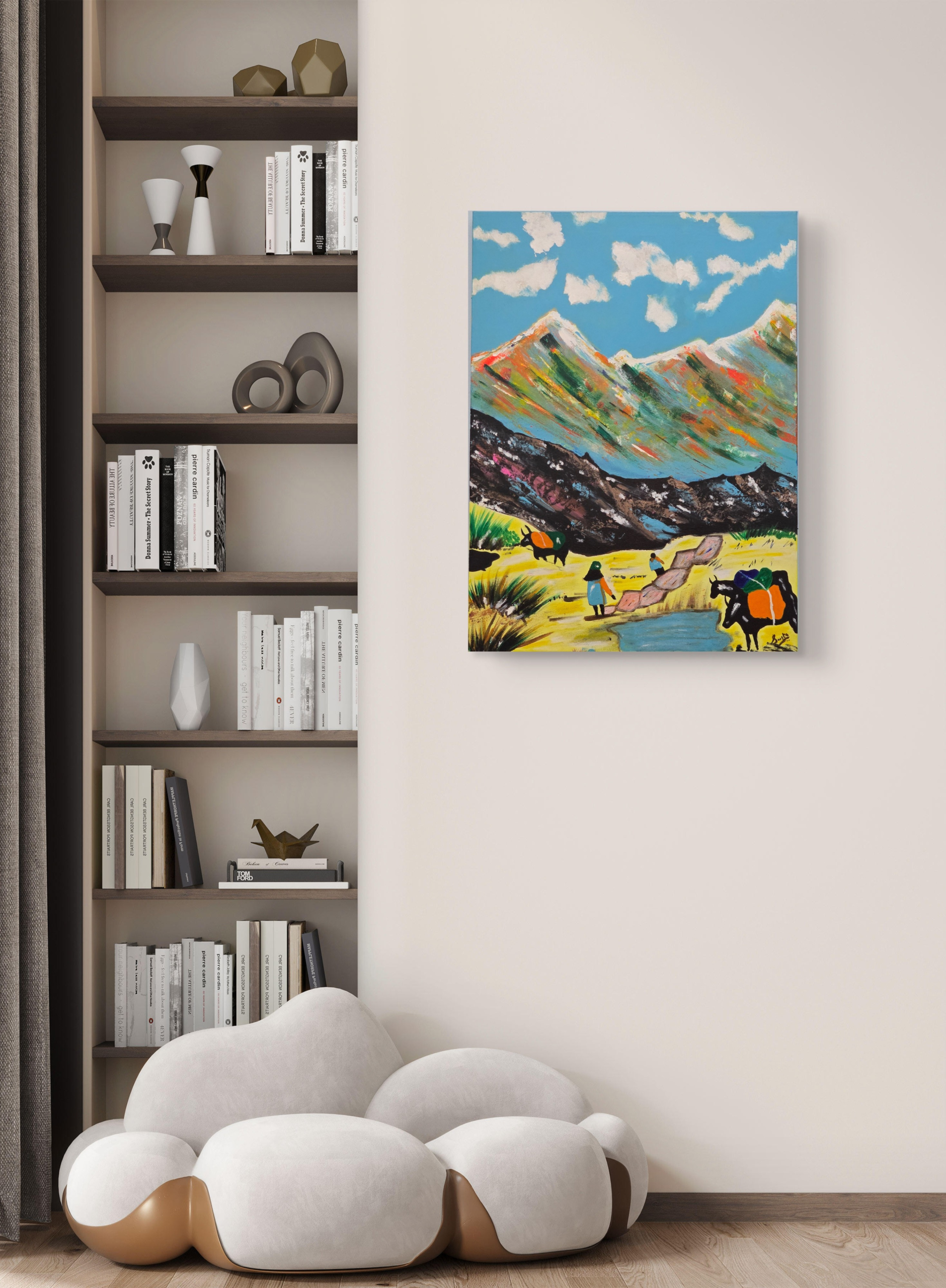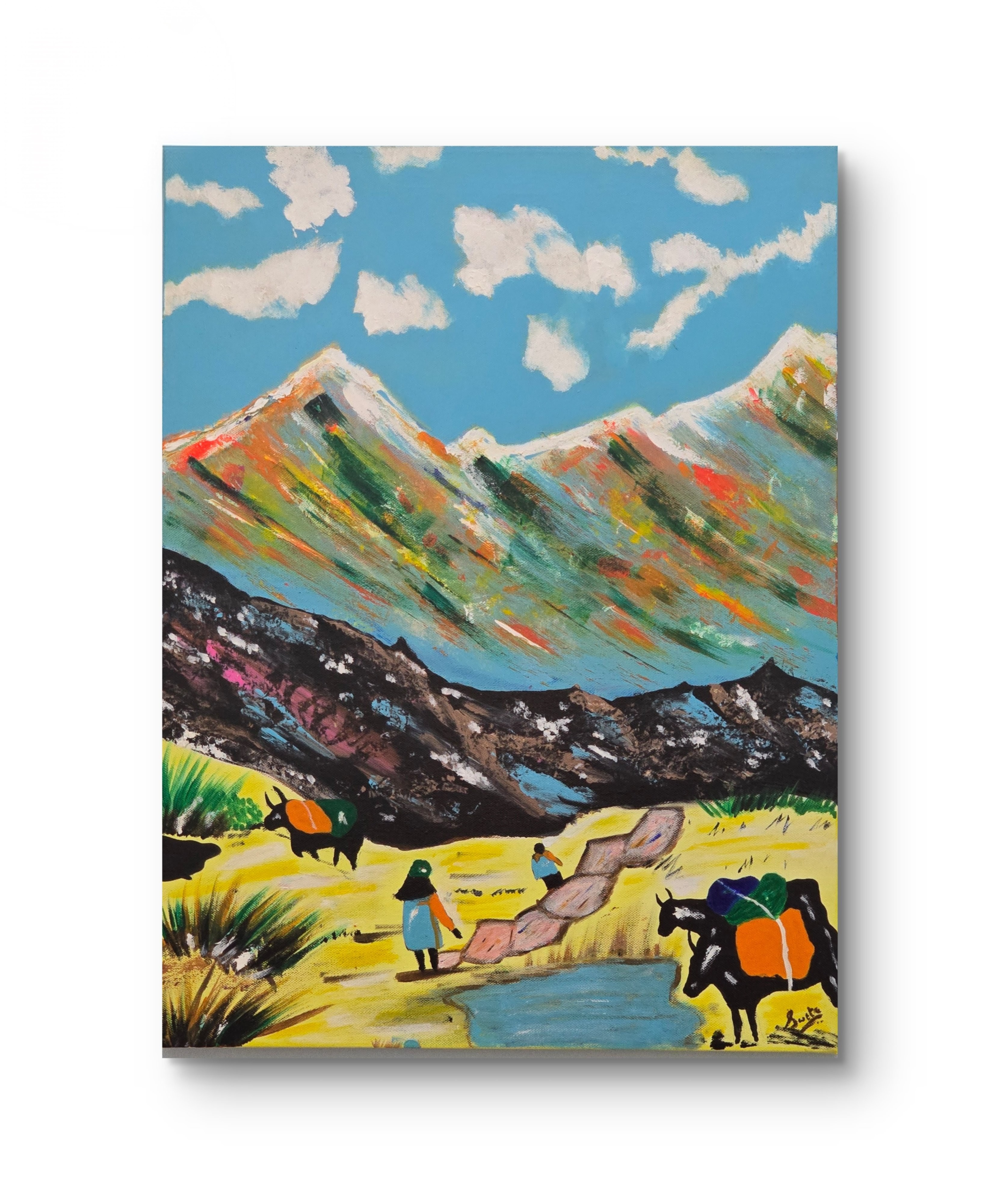 This painting captures the timeless serenity of village life, where the rhythm of days flows as gently as the stream meandering through golden fields. The majestic mountains rise with layers of soft color—greens, blues, and warm earth tones that suggest the changing seasons and eternal cycles of nature’s beauty.